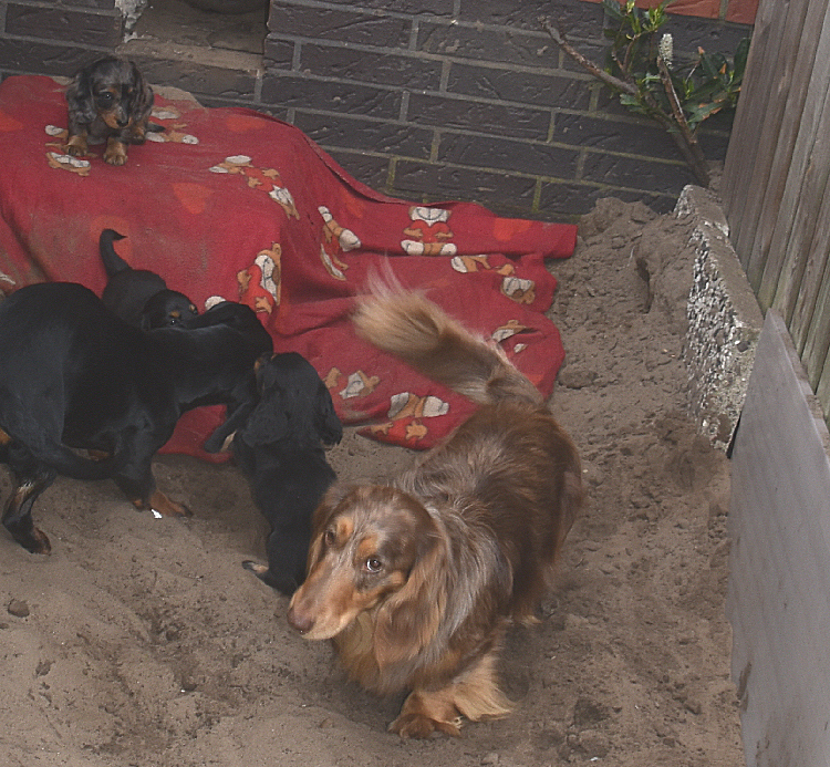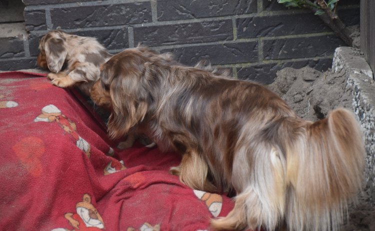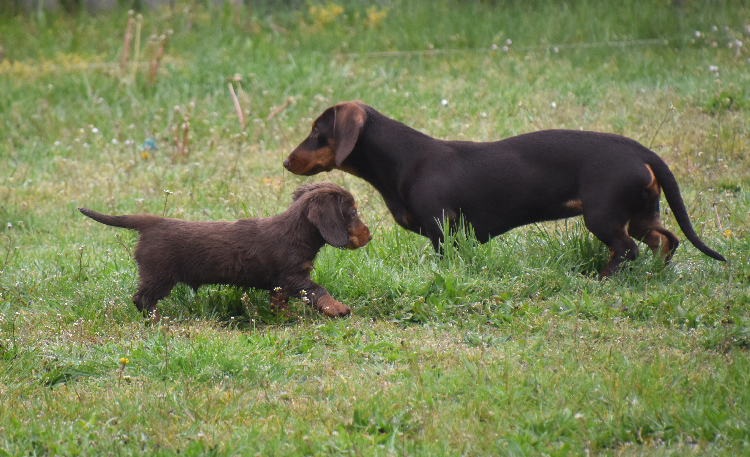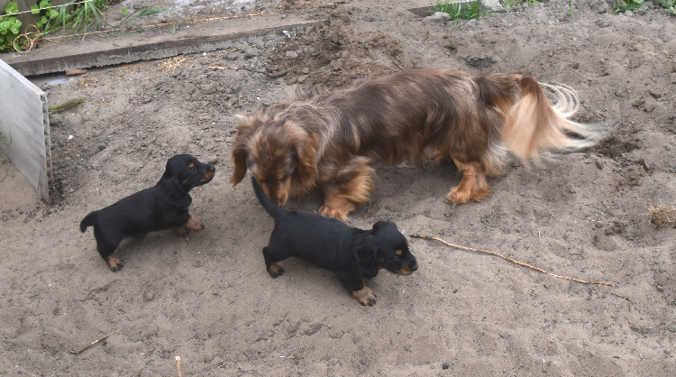 Die Welpen verbringen viel Zeit mit den anderen Hunden im Rudel. Ins neue Zuhause darf ein Welpe nach der ersten Impfung und dem Chippen, wenn ein älterer Hund im neuen Rudel lebt. Dort geht die Erziehung dann nahtlos weiter. Sollte es der einzige Hund im Haus sein, wäre es sinnvoll, den Welpen erst ab frühestens der 10. Woche zu holen, damit er im Rudel möglichst viele Erfahrungen mit anderen Hunden machen kann.